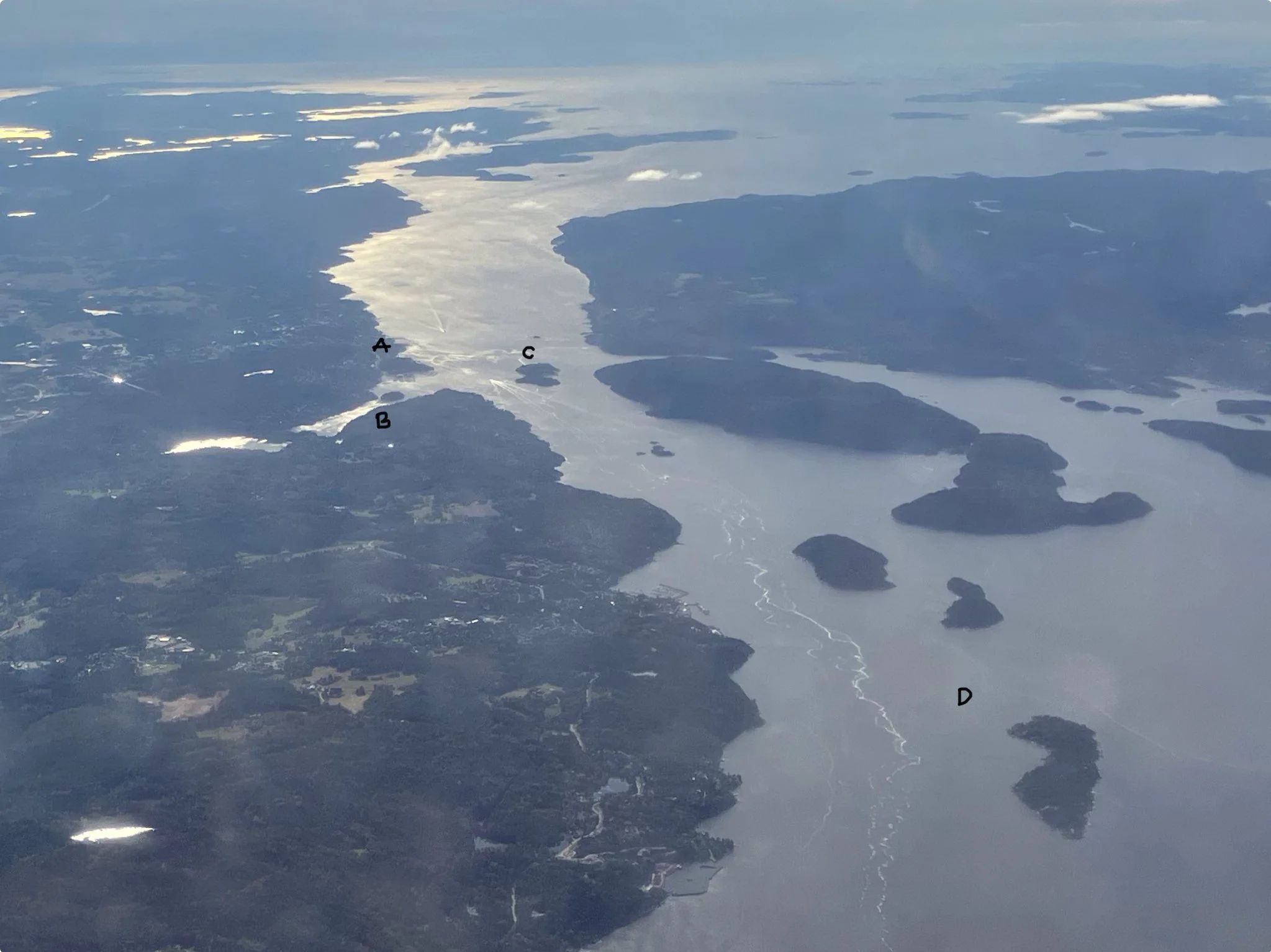 Oslo Fjord, where INVASION is set. Looking south, 2024. A: The port town of Drøbak. B: Hallangspollen, a branch of the main fjord. C: Oscarsborg Fortress. D. Approximate location where the heavy cruiser Blücher sank.